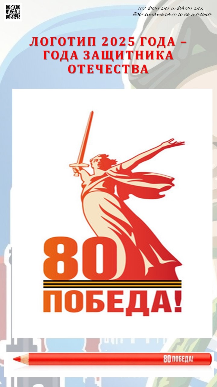 Утвержден логотип Года России 80-летия Великой Победы. За основу взят монумент «Родина-мать зовет!» на Мамаевом кургане в Волгограде. Логотип включает в себя георгиевскую ленту, слово «Победа» и цифру «80». Также разработан бренбук Года 80-летия Победы.