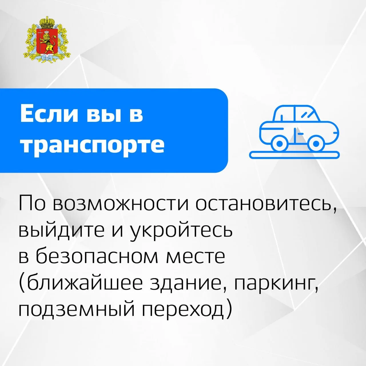 • В помещении: отойдите от окон, укройтесь в коридорах, подвалах. На нижних этажах многоэтажек безопаснее.